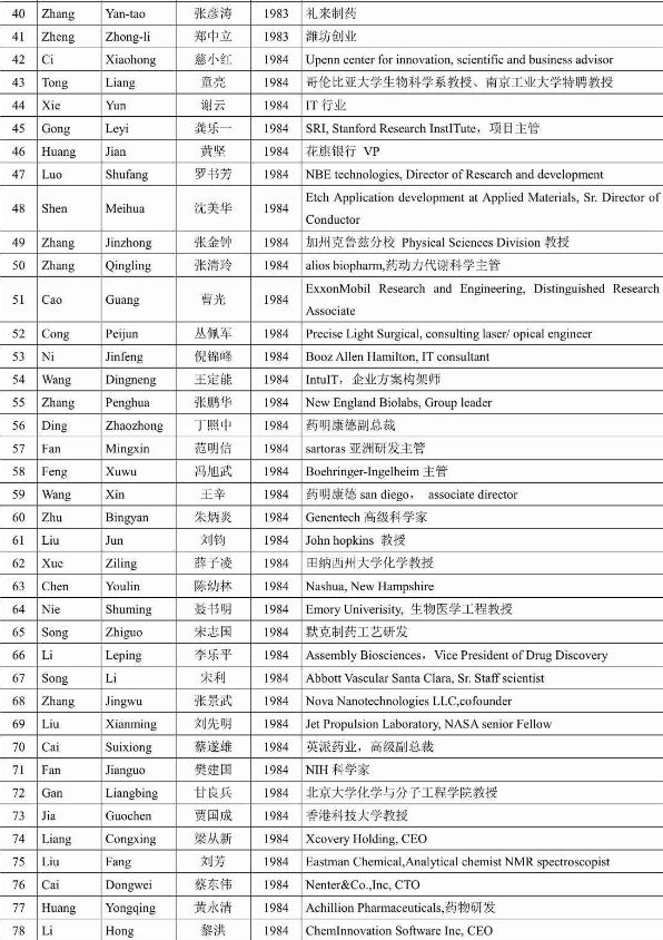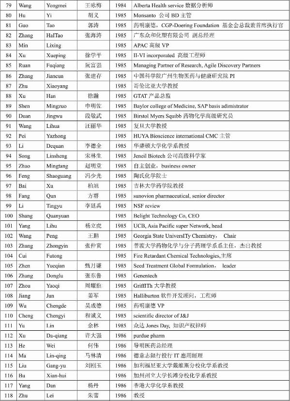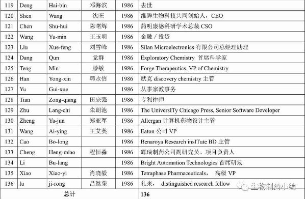 微信公眾號“生物制藥小編”統(tǒng)計了136名項目畢業(yè)生去向,他們大多都成為了學(xué)術(shù)界和業(yè)界領(lǐng)軍人物和中堅力量。中美合作化學(xué)研究生項目雖然僅僅只持續(xù)五年,培養(yǎng)了一批具有國際競爭力的一流科學(xué)家和制藥行業(yè)企業(yè)家。這些在美國工作多年,積累了先進(jìn)研究方法和產(chǎn)業(yè)經(jīng)驗(yàn)的專業(yè)人士回國后,極大助力我國醫(yī)藥研發(fā)行業(yè)的發(fā)展。