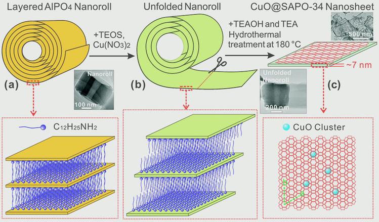 圖1. 二維超薄CuO@SAPO-34分子篩材料的合成過程示意圖:a)層狀磷酸鋁納米卷;b) 硝酸銅與正硅酸乙酯作用下展開的磷酸鋁納米卷;c) 模板劑作用下水熱晶化獲得目標(biāo)產(chǎn)物