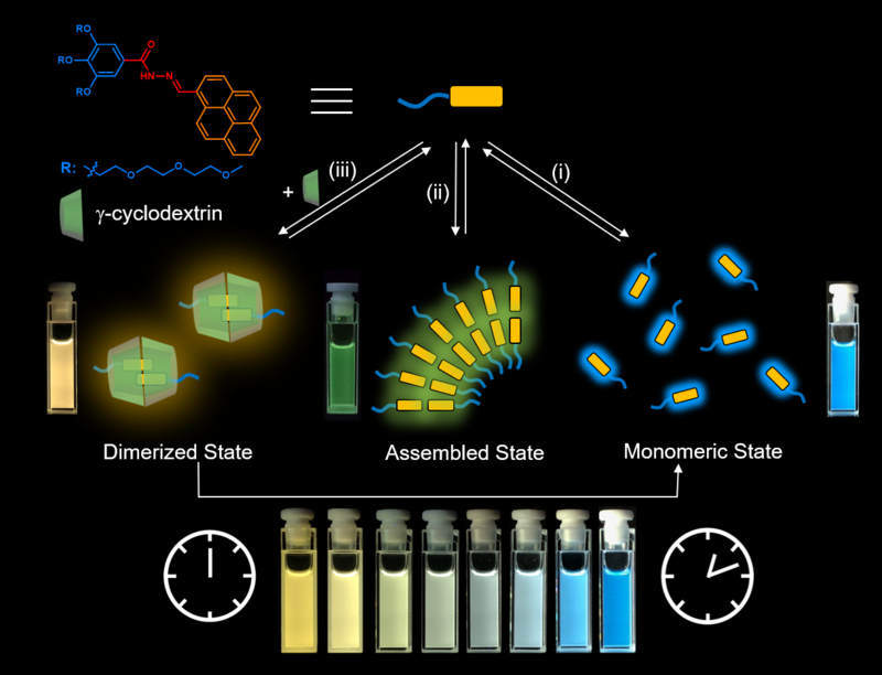 該研究工作中,研究者們通過將熒光團芘以酰腙的方式連接在親水性分子上,構(gòu)建含單一熒光團的兩親性分子,該分子的發(fā)光波長與熒光團芘之間的距離密切相關(guān)。研究者們通過親疏水作用力以及主客體識別作用這兩種超分子手段來實現(xiàn)可逆調(diào)控?zé)晒鈭F芘之間的距離,進(jìn)而實現(xiàn)對其熒光顏色的可逆調(diào)控,在很大范圍內(nèi)能夠調(diào)節(jié)其發(fā)光顏色從藍(lán)到黃并包含白光發(fā)射。同時,研究者們利用α-淀粉酶緩慢催化降解環(huán)糊精大環(huán)的機制,實現(xiàn)了超分子組裝體在酶催化條件下發(fā)生自發(fā)解離過程,進(jìn)而構(gòu)建出以環(huán)糊精為化學(xué)燃料,時間“編程”的非平衡動態(tài)組裝熒光系統(tǒng),并成功應(yīng)用于自擦除的凝膠書寫材料。