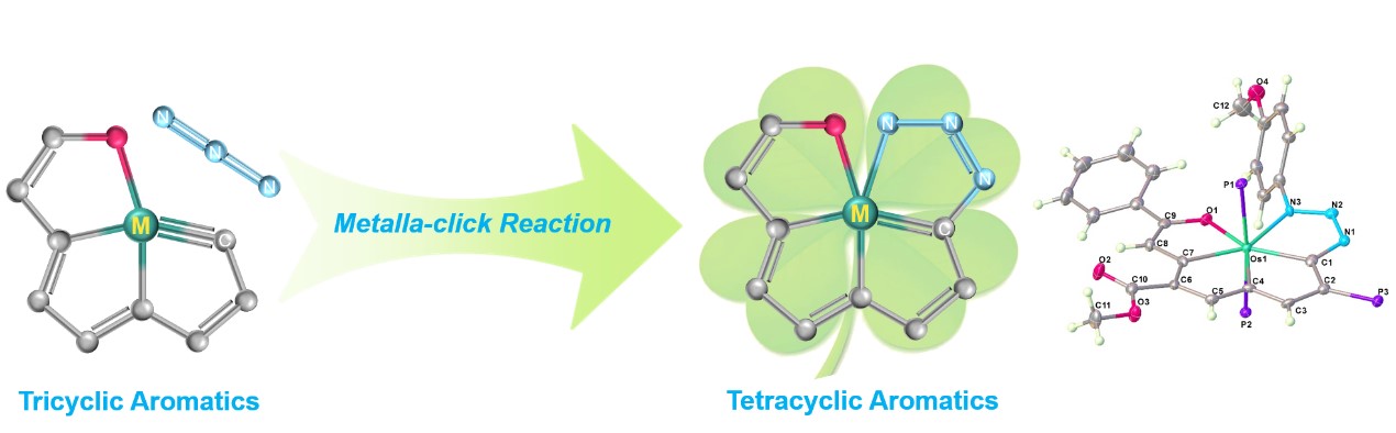 構(gòu)建全新的芳環(huán)骨架,尤其是新稠芳環(huán)骨架,是發(fā)展具有獨(dú)特物理化學(xué)性能的π共軛新體系的重要基礎(chǔ)。但是,化學(xué)發(fā)展到今天,發(fā)現(xiàn)新的分子骨架日趨困難。在經(jīng)典芳香化學(xué)中,由于碳是4價(jià)的,單個(gè)碳原子最多只能稠合3個(gè)芳香環(huán)(如石墨烯)。而過渡金屬可以有多個(gè)配位點(diǎn),且具有種類多、價(jià)態(tài)與配體豐富等多樣性,此外,過渡金屬未充滿的d軌道可以替代主族元素的p軌道參與成鍵,為芳香化學(xué)的發(fā)展帶來全新的機(jī)遇。最近夏海平教授課題組實(shí)現(xiàn)點(diǎn)擊反應(yīng)的新拓展--首例后過渡金屬卡拜與疊氮的[3+2]環(huán)加成反應(yīng),并籍此反應(yīng)成功構(gòu)建了首例以單原子為橋頭稠合四個(gè)芳環(huán)的極端大p共軛結(jié)構(gòu)。從而,結(jié)束了“一個(gè)橋頭原子最多只能被三個(gè)芳香環(huán)共享”的歷史。