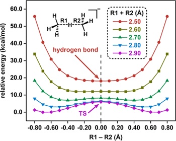 最近,余志祥教授和研究助理王熠博士通過理論計算首次提出了對稱C···H···C氫鍵存在的可能性。作者首先以甲烷與甲基負離子所形成的氫鍵復(fù)合物為例論證了對稱C···H···C氫鍵存在的理論基礎(chǔ)。如圖2所示,當兩個碳原子之間的距離被固定為2.90 ?時,體系展現(xiàn)出了雙勢阱勢能面的特征。隨著兩個碳原子不斷靠近,勢能面逐漸由雙勢阱向單勢阱過渡。最終,當兩個碳原子之間的距離被縮短至2.50 ?時,體系中首次出現(xiàn)了對稱的碳氫碳氫鍵。