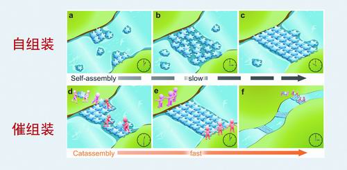 催組裝與自組裝對(duì)比示意圖。如果把組裝類(lèi)比為在一條河上建橋,傳統(tǒng)自組裝效率低、耗時(shí)長(zhǎng),在催組劑的幫助下,浮橋可快速建立起來(lái)。 課題組供圖
