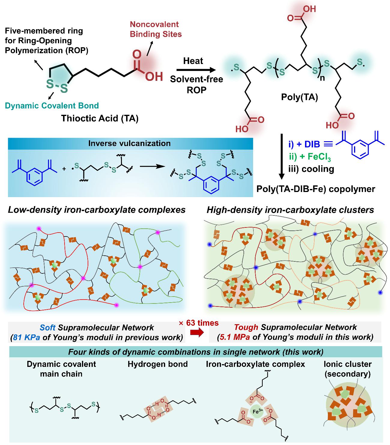 在前期工作中,該課題組開拓出一種全新的聚合方法能夠?qū)⑻烊恍》肿恿蛐了嵋徊睫D(zhuǎn)化成高性能聚合物材料(Sci. Adv. 2018, 4, eaat8192; JACS, 2019, 141, 12804)。雖然這種無(wú)溶劑聚合方法制備的聚合物材料展現(xiàn)了高延展率和快速自修復(fù)性能,但是它的機(jī)械模量較低(僅81KPa),這無(wú)疑限制了其在高性能材料領(lǐng)域的應(yīng)用。同時(shí),高強(qiáng)度的彈性體往往導(dǎo)致網(wǎng)絡(luò)的低動(dòng)態(tài)性,限制了其室溫自修復(fù)性能。因此,如何設(shè)計(jì)出兼具高強(qiáng)度和室溫自修復(fù)性能的彈性體材料是該類材料設(shè)計(jì)長(zhǎng)期存在的挑戰(zhàn)。研究人員發(fā)現(xiàn),在原本體系和方法的基礎(chǔ)上,將鐵離子濃度提升至1%摩爾比,并且避免合成過(guò)程中從空氣中引入的水分子,能夠明顯提升聚合物的機(jī)械模量(超過(guò)60倍),并且良好保持該網(wǎng)絡(luò)的動(dòng)態(tài)性,即展現(xiàn)出優(yōu)異的機(jī)械延展性和室溫自修復(fù)性能。通過(guò)X射線衍射、散射等技術(shù)證明,機(jī)械強(qiáng)度的大幅度提升源于高濃度鐵-羧基復(fù)合物在聚硫辛酸獨(dú)特的無(wú)溶劑聚合網(wǎng)絡(luò)中通過(guò)強(qiáng)庫(kù)侖力形成長(zhǎng)程無(wú)序的離子簇,即在原本三種動(dòng)態(tài)化學(xué)鍵的基礎(chǔ)上進(jìn)一步引入二級(jí)離子鍵交聯(lián)作用。得到的聚合網(wǎng)絡(luò)具有高楊氏模量(5.1 MPa),高機(jī)械延展性(超過(guò)6500%),室溫自修復(fù)(可以在水下進(jìn)行),可重復(fù)加工回收性等。該工作作為前期開創(chuàng)性工作的延伸,進(jìn)一步推動(dòng)了聚硫辛酸自修復(fù)聚合物的性能改善。該成果以“Toughening a Self-Healable Supramolecular Polymer by Ionic Cluster Enhanced Iron-Carboxylate Complexes”為題發(fā)表于Angew. Chem. Int. Ed.。
