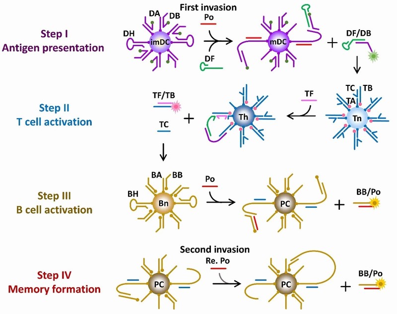 研究發(fā)現(xiàn),在利用一段HIV病毒基因序列模擬病毒侵入過程中,當HIV序列不存在時,該系統(tǒng)中三種DNA分子機器均處于穩(wěn)定的初始狀態(tài)。當HIV序列首次入侵后,機器DC由未成熟狀態(tài)變?yōu)槌墒鞝顟B(tài),將抗原呈遞給機器T,使其由初始態(tài)轉變?yōu)檩o助T細胞狀態(tài),進而激活機器B釋放模擬抗體鏈與病原體結合,模擬免疫系統(tǒng)首次應答過程。當病原體再次入侵上述系統(tǒng),無需機器DC和機器T參與,第一次應答過程中由機器B轉變成的機器PC可直接釋放抗體鏈與病原體結合,該過程比初次應答反應更高效,進而模擬了免疫系統(tǒng)的記憶功能及二次應答。模塊化設計可將該網(wǎng)絡交互系統(tǒng)進一步升級,響應于不同的分子,如腫瘤標志物miRNA或蛋白、釋放小干擾RNA、反義寡核苷酸或miRNA抑制劑等,有望拓展開發(fā)感知細胞內多種刺激物的智能靶向診療系統(tǒng)。英國皇家化學會Chemistry World對此工作進行了詳細評述(https://www.chemistryworld.com/news/first-three-component-artificial-immune-system-made-of-dna-studded-gold-nanomachines/4011282.article)。