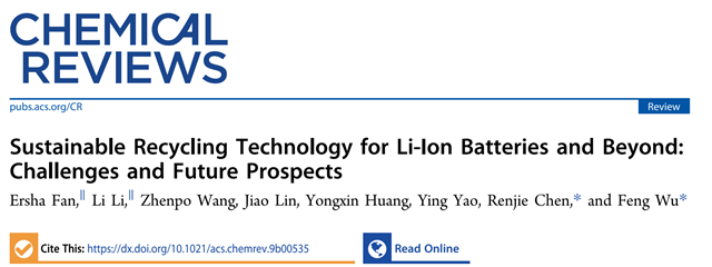 北京理工大學(xué)材料學(xué)院吳鋒院士團(tuán)隊多年來在電池回收利用與資源化再生方面做了大量的創(chuàng)新研究工作,近日在國際頂級期刊《Chemical Reviews》(影響因子54.301)上在線發(fā)表題為《Sustainable Recycling Technology for Li-Ion Batteries and Beyond: Challenges and Future Prospects》的綜述論文,對可充電電池(鋰離子電池及下一代電池新體系)的可持續(xù)性進(jìn)行了系統(tǒng)全面的論述。