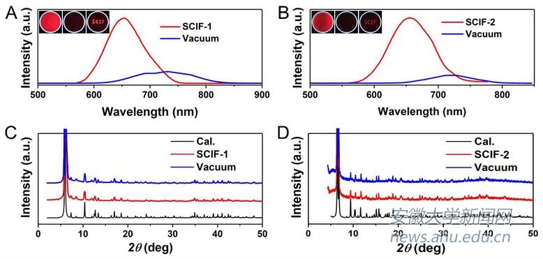 組裝后形成的SCIF-1和SCIF-2框架材料具有熒光性能,其熒光量子產(chǎn)率分別為6.73%和5.49%。該材料對相對小尺寸的質(zhì)子性溶劑具有特征的開關(guān)響應(yīng)性。在真空去溶劑化之后,材料的熒光性能大大減弱,而對材料進(jìn)行小尺寸質(zhì)子性溶劑處理之后,材料的熒光性能則可以完全恢復(fù),而其它非質(zhì)子性溶劑及大尺寸質(zhì)子性溶劑則不能顯示出熒光恢復(fù)的現(xiàn)象。結(jié)合上述實(shí)驗(yàn)現(xiàn)象,我們推測這一質(zhì)子性溶劑開關(guān)響應(yīng)性能可能是由于質(zhì)子性溶劑與框架孔道中SbF6-上的F原子之間形成了氫鍵,削弱了材料中連接體和配體的振動,從而增強(qiáng)了輻射躍遷過程,使得熒光得以呈現(xiàn)和恢復(fù)。