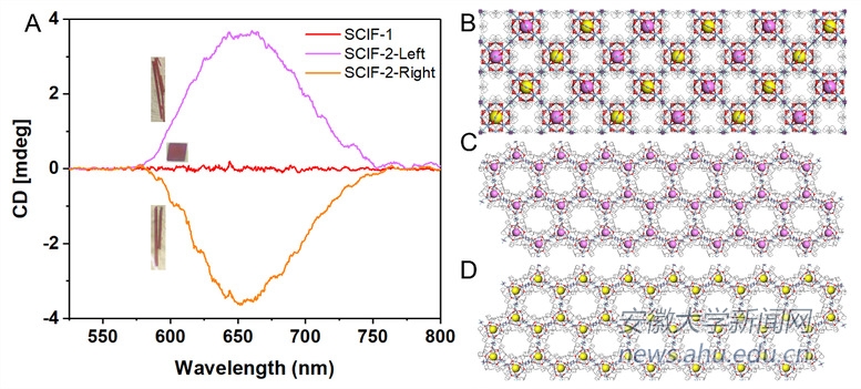 三維框架材料在傳感檢測,藥物遞送,儲能,催化等領(lǐng)域有著廣泛的應(yīng)用。近日,安徽大學(xué)物質(zhì)科學(xué)與信息技術(shù)研究院能源材料與化學(xué)研究所陳爽副教授等通過雙相配體交換法合成了一種新型框架材料[Au1Ag22(SR)12]3+,命名為超原子配合物無機(jī)框架材料(Superatom Complex Inorganic Framework。SCIF)。并利用NaSbF6中的SbF6-成功的實(shí)現(xiàn)了對該材料的組裝,獲得了兩種具有不同構(gòu)型的三維框架材料SCIF-1和SCIF-2。組裝后的材料具有優(yōu)異的光致發(fā)光性能,對質(zhì)子性溶劑也具有較強(qiáng)的特征性響應(yīng)。相關(guān)成果以“Assembly of the Thiolated [Au1Ag22(S-Adm)12]3+ Superatom Complex into a Framework Material through Direct Linkage by SbF6- Anions”為題在《德國應(yīng)用化學(xué)》(Angew. Chem. Int. Ed.)上報(bào)道。