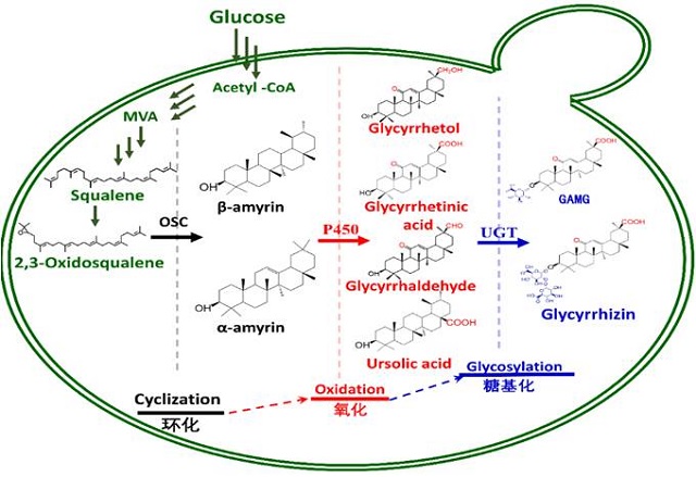 中藥方劑中的十方九草中的“草”指的就是傳統(tǒng)中藥甘草,又稱國(guó)老,具有清熱解毒之功效又用以調(diào)和諸藥。其中,甘草三萜是甘草的主要活性成分,如甘草酸及其衍生物等具有抗病毒、抗腫瘤、抗炎癥等多種生理活性同時(shí)又不抑制人體免疫系統(tǒng),是肝臟炎癥治療中的抗炎癥藥物代表。當(dāng)前,在湖北抗擊新冠肺炎治療中使用的甘草酸二胺組合維生素C發(fā)揮了積極作用。李春教授課題組前期開創(chuàng)性地利用微生物合成植物甘草中主要三萜類化合物的系列研究(單葡萄醛酸基甘草次酸Chem Eng Sci 2014;β-香樹脂醇AIChE Journal 2015;角鯊烯Chem Eng Sci 2016A和2016B;α-香樹脂醇ACS Synthetic Biology 2018;甘草次酸Metabolic Engineering 2018;催化關(guān)鍵酶J Biological Chem 2018和J Physical Chem Lett 2018;甘草次酸衍生物J Agric Food Chem 2019和Critical Rev in Biotechnol 2019;甘草稀有三萜ACS Catalysis 2020),有望解決目前挖根提酸、破壞植被與生態(tài)的不可持續(xù)的獲取方式(研究過程見下圖)。然而,甘草中還存在一些含量極低、具有重要生理功能的稀有三萜化合物包括甘草次醇、甘草次醛以及甘草次醇的同分異構(gòu)體等。它們除了具有重要的生理活性外,這些稀有三萜分子骨架上的羥基、醛基等功能基團(tuán)的存在為對(duì)其進(jìn)一步修飾,從而獲得結(jié)構(gòu)更加多樣、功能更加豐富的新型衍生物提供了可能。但這些稀有三萜在甘草根中含量極低以及復(fù)雜的分子結(jié)構(gòu),導(dǎo)致這類化合物難以直接提取或化學(xué)合成制備。