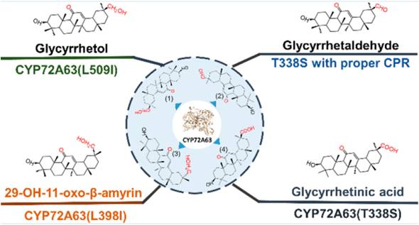 本文利用甘草中合成甘草次酸的P450單加氧酶CYP72A63基于同源建模與分子對(duì)接等技術(shù)進(jìn)行輔助理性設(shè)計(jì),重塑其活性口袋以控制對(duì)于不同中間產(chǎn)物的契合度。通過提高甘草次醇的契合度實(shí)現(xiàn)了甘草次酸特異性合成,通過降低甘草次醇的契合度防止了其進(jìn)一步氧化實(shí)現(xiàn)了甘草次醇的特異性合成。通過控制C-29和C-30相對(duì)于血紅素鐵的相對(duì)位置,實(shí)現(xiàn)了對(duì)底物C-29的特異性氧化,進(jìn)一步通過CPR的匹配優(yōu)化首次實(shí)現(xiàn)了甘草次醛類中間產(chǎn)物的特異性合成。同時(shí)利用釀酒酵母的體內(nèi)驗(yàn)證方式解決了突變體體外試驗(yàn)難以進(jìn)行的問題。