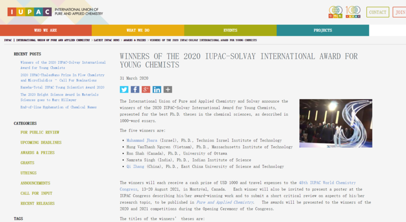 IUPAC成立于1919年,被公認為世界上最大、最具權(quán)威性的化學組織,致力于推動解決化學科學的世界問題,促進化學更好地服務(wù)于人類的發(fā)展。自2000年開始設(shè)立國際青年化學家獎,每年評選一次,旨在對上一年度全世界范圍內(nèi)最優(yōu)秀的化學博士學位論文進行獎勵,以鼓勵這些正處事業(yè)起步階段的優(yōu)秀青年化學家。每年全球僅有4~5名正式獲獎?wù)?,另?~6人獲得提名獎。
