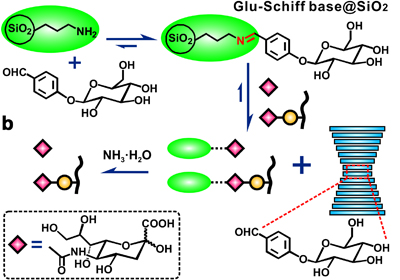 該研究團(tuán)隊(duì)基于動(dòng)態(tài)共價(jià)化學(xué)方法,實(shí)現(xiàn)了精確捕獲唾液酸糖鏈。該策略與傳統(tǒng)的靜態(tài)親合策略不同,巧妙地利用了席夫堿中存在的動(dòng)態(tài)共價(jià)化學(xué)鍵,使其水解部分與唾液酸糖鏈形成穩(wěn)定的復(fù)合物。所開發(fā)的材料對(duì)唾液酸糖肽展現(xiàn)出優(yōu)異的富集選擇性,吸附容量高,富集回收率好,達(dá)到了唾液酸糖肽富集領(lǐng)域的較高水平。這為生物化學(xué)家提供了一種新穎、有力的策略,可用于精確捕捉與癌癥和免疫疾病發(fā)生密切相關(guān)的糖鏈信息。另一方面,該材料易于水解的特性,改變了科研人員對(duì)傳統(tǒng)富集材料必須具備良好化學(xué)穩(wěn)定性的認(rèn)知。更重要的是,研究人員發(fā)現(xiàn)席夫堿水解反應(yīng)背后隱藏著一個(gè)有趣的現(xiàn)象,席夫堿自犧牲水解后與唾液酸糖鏈發(fā)生了高選擇性的結(jié)合,同時(shí)水解脫落部分進(jìn)行了有序自組裝,共同促進(jìn)了水解反應(yīng)的發(fā)生。該研究展現(xiàn)了動(dòng)態(tài)共價(jià)化學(xué)在糖蛋白組學(xué)和生物分子傳感領(lǐng)域的獨(dú)特優(yōu)勢(shì)。