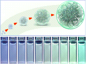 通過進(jìn)一步地探究,該超分子多面體結(jié)構(gòu)能夠在乙腈和氯仿的混合溶劑中聚集,形成直徑從幾個(gè)納米到幾百個(gè)納米的球狀多級(jí)組裝體。在形成超分子多級(jí)組裝體的過程中,三聯(lián)吡啶金屬多面體展現(xiàn)了明顯的聚集誘導(dǎo)熒光(AIE)增強(qiáng)的性質(zhì)。這些結(jié)果為進(jìn)一步的制備具有光學(xué)活性的軟物質(zhì)材料提供了方向。