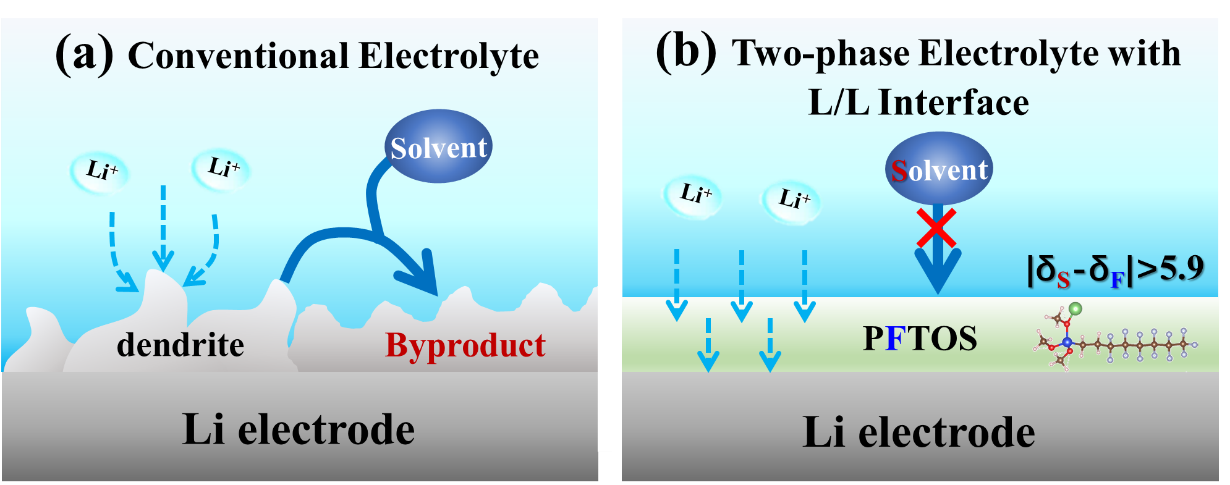 圖 (a):傳統(tǒng)電解液體系中鋰電極的腐蝕和枝晶生長;(b):液/液界面兩相電解液體系抑制鋰電極的腐蝕和枝晶生長,增強(qiáng)鋰電極的穩(wěn)定性。