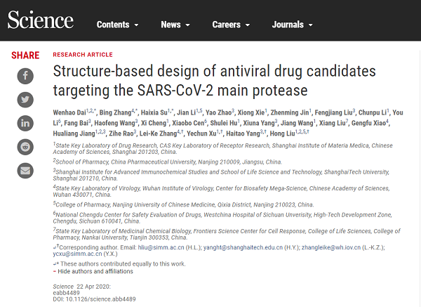 近日,中國(guó)科學(xué)院上海藥物研究所柳紅/許葉春/蔣華良團(tuán)隊(duì)聯(lián)合上??萍即髮W(xué)楊海濤/饒子和團(tuán)隊(duì)和中國(guó)科學(xué)院武漢病毒所張磊砢/肖庚富團(tuán)隊(duì)通力合作,在抗新型冠狀病毒藥物研究中取得重要進(jìn)展,發(fā)現(xiàn)一類結(jié)構(gòu)新穎、高效、安全的抗SARS-CoV-2病毒候選藥物。該研究成果于3月28日發(fā)表在生物預(yù)印本網(wǎng)站bioRxiv上,并于4月22日在Science上在線發(fā)表。
