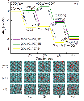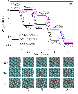 湖南大學(xué)材料科學(xué)與工程學(xué)院郭坤琨、袁定旺教授與四川省新材料研究中心王斌、程建麗研究員合作,利用第一性原理密度泛函理論(DFT)計算,首次研究了碳化鉬(Mo2C)作為Li-CO2電池陰極催化劑的反應(yīng)機理。根據(jù)前人的實驗研究,設(shè)計了5條不同的反應(yīng)路徑,計算不同中間產(chǎn)物的吉布斯自由能變化,從中選擇了在三個碳化鉬(Mo2C)晶面的最優(yōu)反應(yīng)路徑,見圖1。系統(tǒng)研究了草酸鋰(Li2C2O4)和碳酸鋰(Li2CO3)成核過程中不同中間產(chǎn)物的吉布斯自由能變化,見圖2。理論結(jié)果也進(jìn)一步表明三個碳化鉬(Mo2C)晶面均抑制了草酸鋰(Li2C2O4)分解形成碳酸鋰(Li2CO3)的化學(xué)反應(yīng)。因此,這些研究從理論上證明了Li2C2O4可以作為最終放電產(chǎn)物被穩(wěn)定下來,從而阻止進(jìn)一步形成Li2CO3。利用Bader電荷分析研究了吸附在催化表面上的Li2C2O4的表面電荷分布,發(fā)現(xiàn)在Li2C2O4和Mo2C表面之間存在電子轉(zhuǎn)移。這些研究將促進(jìn)對Li-CO2電池中電化學(xué)過程的理解和認(rèn)識,也為Li-CO2電池陰極催化劑的設(shè)計和優(yōu)化提供直接的理論指導(dǎo)。