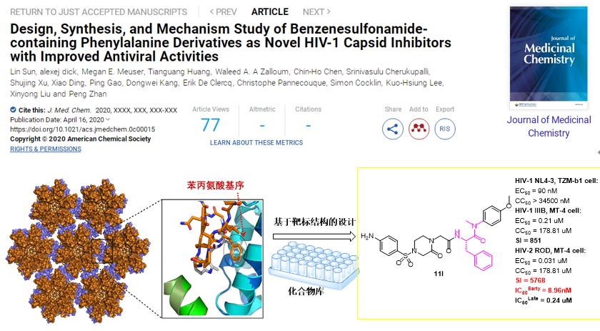 上述研究成果已在線發(fā)表于藥物化學領域國際頂尖期刊Journal of Medicinal Chemistry(J Med Chem. 2020 Apr 16. doi: 10.1021/acs.jmedchem.0c00015.),第一作者為山東大學藥學院在讀博士生孫林,劉新泳教授、展鵬副教授、北卡羅來納大學Kuo-Hsiung Lee教授及德雷克塞爾大學Simon Cocklin教授為本論文的共同通訊作者。目前,該成果已申請多項中國發(fā)明專利。