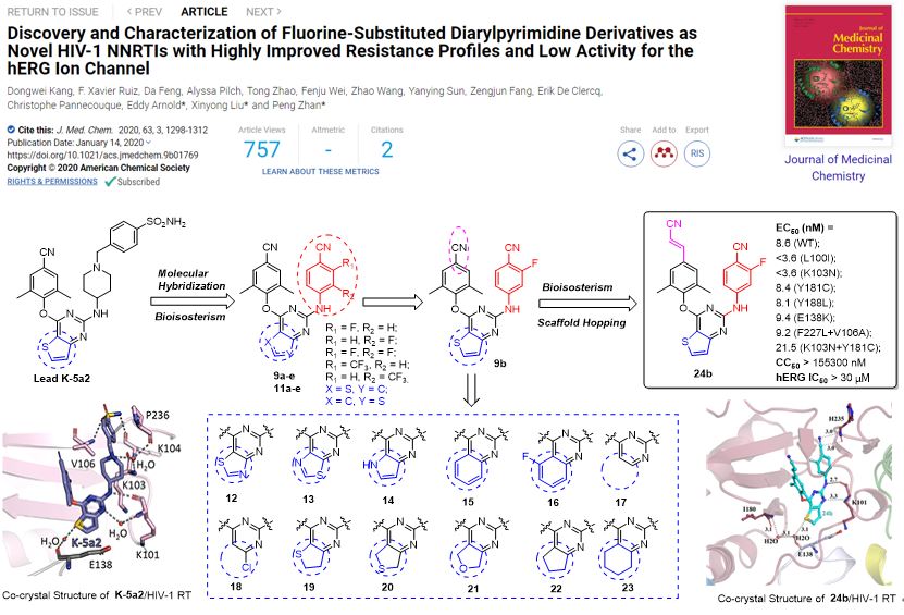上述研究成果已連續(xù)在Journal of Medicinal Chemistry發(fā)表2篇文章(J Med Chem.2020,63, 1298-1312;J Med Chem.2020 Apr 15. doi: 10.1021/acs.jmedchem.0c00117.),第一作者均為山東大學特別資助類博士后康東偉;山東大學藥學院劉新泳教授、展鵬副教授均為兩篇文章的共通訊作者;羅格斯大學Eddy Arnold教授及比利時魯汶大學Christophe Pannecouque教授分別為兩篇論文的共同通訊作者。