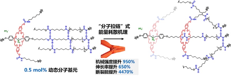 研究者們創(chuàng)新性地將擬輪烷交聯(lián)劑引入具有豐富的氫鍵堆積域的聚氨酯網(wǎng)絡(luò),得到兼具主客體相互作用和氫鍵作用的超分子聚合物網(wǎng)絡(luò)。利用極少量(0.5 mol%)的擬輪烷交聯(lián)劑就可以使聚氨酯的機(jī)械強(qiáng)度提高950%,伸長率提高650%,斷裂能提升4470%。研究人員進(jìn)一步通過傅里葉變換紅外光譜和X射線衍射等技術(shù)證明了機(jī)械作用下的氫鍵斷裂,并由此證明這種機(jī)械增強(qiáng)是由于滑環(huán)效應(yīng)與氫鍵堆積網(wǎng)絡(luò)的協(xié)同作用,使得氫鍵堆積域被分子拉鏈?zhǔn)降幕瑒油狡茐牡哪芰亢纳C(jī)制得以實現(xiàn)。這項工作為高性能彈性體的構(gòu)建提供了新策略,同時推動了人工分子機(jī)器在無溶劑型聚合網(wǎng)絡(luò)中的實際應(yīng)用。