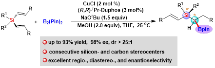 東北師范大學(xué)熊濤、張前教授發(fā)展了一種高效的雙烯基硅烷的不對(duì)稱硼氫化反應(yīng),去對(duì)稱化地連續(xù)構(gòu)建了手性硅、手性碳立體中心,同時(shí)向分子中引入重要的硼基團(tuán)。該反應(yīng)不僅有效克服了去對(duì)稱化過(guò)程中存在的化學(xué)、區(qū)域、非對(duì)映以及對(duì)映選擇性難以同時(shí)調(diào)控的問(wèn)題,還在高活性親核試劑存在下避免了已構(gòu)建的硅立體中心可能的消旋化,實(shí)現(xiàn)了雙苯乙烯基硅烷與聯(lián)硼酸頻哪醇酯(B2pin2)的去對(duì)稱化硼氫化反應(yīng),以高的化學(xué)、區(qū)域、對(duì)映及非對(duì)映選擇性合成了一系列多手性中心的含硼有機(jī)硅烷。