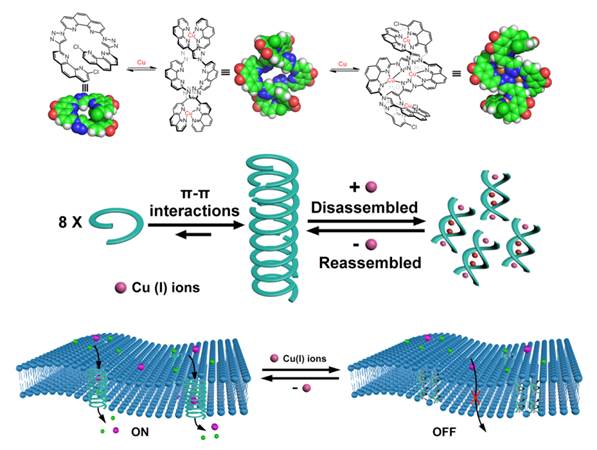 天然離子通道通過(guò)對(duì)外界刺激的響應(yīng)實(shí)現(xiàn)離子可控、高效、選擇性地穿過(guò)細(xì)胞膜產(chǎn)生化學(xué)信號(hào)或電信號(hào),從而調(diào)節(jié)多種生理現(xiàn)象,影響細(xì)胞生命。然而,利用化學(xué)合成體系來(lái)構(gòu)建人工離子通道并復(fù)制天然離子通道的功能仍面臨巨大挑戰(zhàn)。受天然KcsA K+通道的啟發(fā),朱俊彥博士精確設(shè)計(jì)了具有銅離子調(diào)控含孔道單螺旋和無(wú)孔道雙螺旋互變行為的芳香螺旋寡聚物,利用具孔道單螺旋自發(fā)形成的一維自組裝螺旋管,嵌入磷脂雙分子層,展現(xiàn)了高效、穩(wěn)定的離子通道性能。隨后,通過(guò)銅離子配位與去配位誘導(dǎo)單雙螺旋結(jié)構(gòu)互變進(jìn)而導(dǎo)致的自組裝螺旋管的解組裝和重新組裝,實(shí)現(xiàn)了所設(shè)計(jì)離子通道的可逆關(guān)閉與打開(kāi)。該工作首次利用單雙螺旋結(jié)構(gòu)互變,構(gòu)建了第一例原位配體門(mén)控的可逆仿生離子通道,研究結(jié)果對(duì)于理解天然離子通道的行為機(jī)制具有重要的生物學(xué)意義,也為開(kāi)發(fā)在生物學(xué)和醫(yī)藥學(xué)領(lǐng)域具有潛在應(yīng)用的智能仿生納米通道提供了全新的思路。我院2017級(jí)碩士研究生白東亞為論文第一作者,朱俊彥博士為第一通訊作者,河南大學(xué)為第一署名單位。