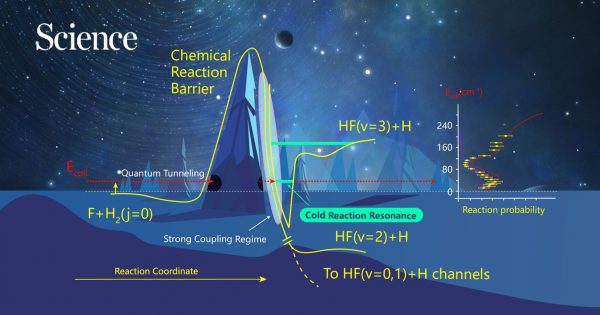 評述文章還介紹了一個趨近絕對零度量子散射共振在化學(xué)反應(yīng)中發(fā)揮重要作用的例子。F+H2→HF+H 反應(yīng)是星際化學(xué)中產(chǎn)生HF分子的重要過程。但是F+H2反應(yīng)具有1.8 kcal/mol高度的勢壘(629 cm-1),經(jīng)典模型下在接近絕對零度時這個反應(yīng)幾率是完全可以忽略的。2019年,大連化物所研究團(tuán)隊(duì)通過利用H原子里德堡態(tài)標(biāo)示時間飛渡譜技術(shù),觀測到了反應(yīng)溫度低至14 K(9.8 cm-1)時此反應(yīng)仍然發(fā)生的證據(jù),同時觀測到了約 40 cm-1碰撞能的一個反應(yīng)共振峰。進(jìn)一步理論分析表明,F(xiàn)+H2在低溫時的反應(yīng)性,是通過反應(yīng)共振態(tài)所增強(qiáng)的隧穿效應(yīng)而產(chǎn)生的,而不是通常簡單的隧穿效應(yīng),這也是在接近絕對零度下此反應(yīng)仍然可以發(fā)生的原因。如果將共振態(tài)所導(dǎo)致的共振增強(qiáng)效應(yīng)移除,F(xiàn)+H2(v=0,j=0)在10K溫度以下的反應(yīng)速率常數(shù),會降低三個數(shù)量級以上。