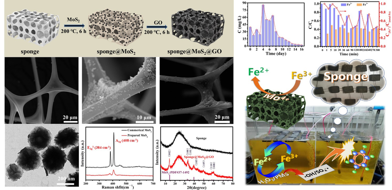 為了克服上述挑戰(zhàn),邢明陽(yáng)教授研究團(tuán)隊(duì)采用簡(jiǎn)單的浸漬-加熱的化學(xué)方法,開(kāi)發(fā)了三維硫化鉬(3D-MoS2海綿)助催化(類)芬頓反應(yīng)體系,實(shí)現(xiàn)了對(duì)染料類及抗生素類廢水的高效處理。與傳統(tǒng)芬頓體系及已報(bào)道的助催化(類)芬頓體系相比,其優(yōu)勢(shì)表現(xiàn)為:三維結(jié)構(gòu)優(yōu)化AOPs性能優(yōu)勢(shì)。以Fe3+/H2O2體系為例,3D-MoS2海綿的引入,可使其降解芳香族有機(jī)污染物的反應(yīng)速率常數(shù)提高到原來(lái)的52倍;助催化反應(yīng)中心減少鐵的用量,降低生成鐵泥的風(fēng)險(xiǎn)。3D-MoS2海綿中納米花片層堆積和不規(guī)則邊緣可以提供更多的Mo4+活性位點(diǎn),加速Fe3+/Fe2+的循環(huán),抑制鐵泥等二次污染物的形成;運(yùn)行成本低,實(shí)現(xiàn)大規(guī)模高效處理抗生素廢水。3D-MoS2/Fe2+/PMS體系只需一次性加入鐵離子(20mg/L硫酸亞鐵),即可實(shí)現(xiàn)連續(xù)高效處理140L高濃度磺胺嘧啶廢水(120mg/L),其降解率可達(dá)97.87%。該體系可穩(wěn)定運(yùn)行16天以上,且其處理1噸廢水的運(yùn)行成本僅為0.33美元,使其具有巨大的工業(yè)應(yīng)用價(jià)值。