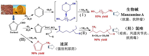 磷酸氯喹是一種上市多年的抗瘧疾藥物,也可用于治療腸外阿米巴病,還有抗風濕、抗病毒作用等,其關鍵側鏈化合物N,N-二乙基-1,4-戊二胺的合成經歷胺化還原的過程(見路線Ⅱ),該過程以傳統(tǒng)Raney Ni為催化劑在間歇反應釜中生產,催化劑易失活和流失,生產效率低。基于前期研究基礎,通過優(yōu)化納米鎳催化劑的結構、組成和制備方法,該研究小組發(fā)展了氯喹關鍵側鏈化合物的連續(xù)高效還原胺化合成新方法,在固定床反應器中實現(xiàn)了氯喹側鏈化合物的高收率合成,催化劑壽命超過500小時(工業(yè)原料),合成的2700 g N,N-二乙基-1,4-戊二胺(色譜純度95%,進一步精餾后達99.5%以上)已用于原料藥的生產,該工作已申報中國發(fā)明專利兩件。此外,以生物糠醛直接還原胺化,他們也高收率獲得了高附加值糠胺(路線Ⅲ)。