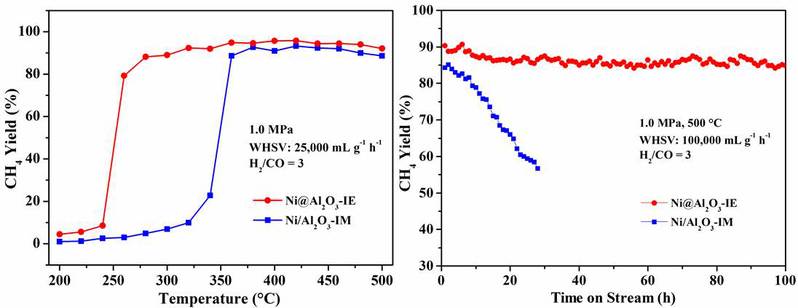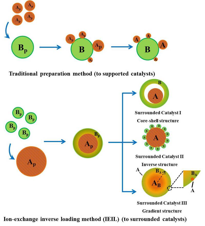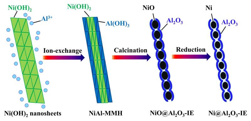 負載型催化劑在多相催化過程中被廣泛使用,其中活性相和載體之間的界面相互作用及界面密度對催化反應機制及催化性能的影響一直以來備受關注。傳統(tǒng)負載型催化劑一般通過浸漬法和沉淀法制備,通常只能提供有限的界面密度且界面相互作用較弱,影響其催化活性和使用穩(wěn)定性。針對這些問題,介觀催化團隊郭學鋒課題組提出反向設計構(gòu)造包圍型催化劑的設想,并發(fā)展了一種簡易且普適的包圍型催化劑制備方法,即離子交換逆負載法制備包圍型催化劑。在這個過程中,活性金屬氫氧化物前體(Ap)投入到載體前體(Bp)的溶液中,在氫氧化物溶度積的差異下發(fā)生離子交換反應,載體前體的金屬離子取代Ap表面的金屬離子形成混合金屬氫氧化物,隨后經(jīng)焙燒、還原形成具有核殼結(jié)構(gòu)的A@B包圍型催化劑。例如Ap代表Ni(OH)2納米片,用Al3+大量交換Ni2+,最終得到具有核殼結(jié)構(gòu)的Ni@Al2O3-IE包圍型催化劑。調(diào)控不同的離子交換程度及金屬、載體前驅(qū)體的種類,還可得到具有反相結(jié)構(gòu)、梯度結(jié)構(gòu)的包圍型催化劑。相比于傳統(tǒng)負載型催化劑,包圍型結(jié)構(gòu)具有更高的界面密度和相互改變的界面性質(zhì),并且因為活性相被載體物理隔離具有高穩(wěn)定性,使其在催化反應中表現(xiàn)出更優(yōu)越的催化性能。例如Ni@Al2O3-IE包圍型催化劑,在CO甲烷化反應中表現(xiàn)出優(yōu)異的低溫活性及高溫穩(wěn)定性。
