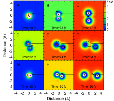 H + HD → H2 +D反應散射的軌線示意動畫,其中的黑色曲線代表進攻 H 原子的運動軌跡。