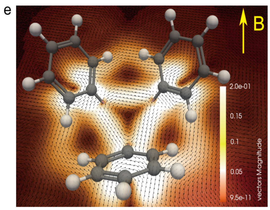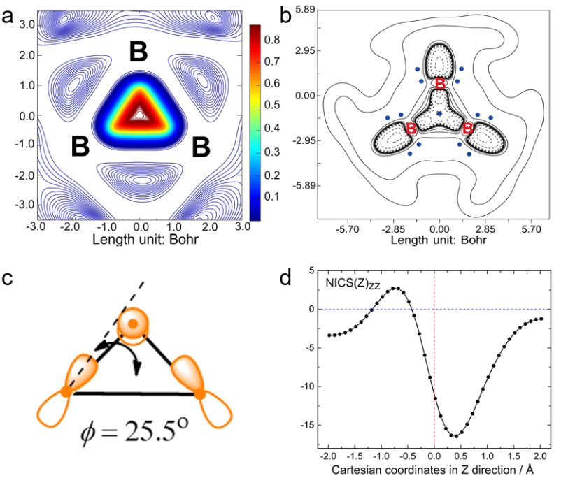 圖2 a)B3平面上Z = 1.0 Bohr處LOL等高線填色圖;b)B3平面上Z = 1.0 Bohr處電子密度拉普拉斯函數(shù)的拓?fù)浞治觯?/span>c)硼原子之間p軌道的夾角為25.5o;(d) B3平面的NICSZZ值隨垂直方向距離的變化;e)B3平面上方的Z = 1 Bohr處感應(yīng)電流截面圖。