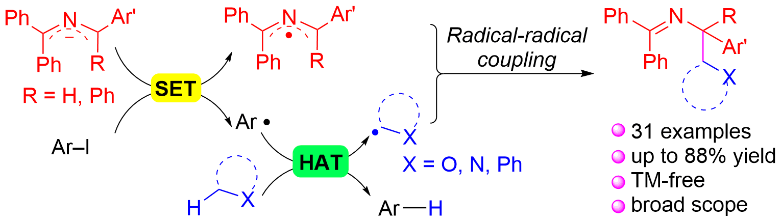 該項工作使用氮雜烯丙基陰離子作為超電子給體(SED),以大位阻的芳基碘化物作為電子受體,二者通過單電子轉(zhuǎn)移(SET)形成氮雜烯丙基自由基及芳基自由基,后者進一步與飽和雜環(huán)通過氫原子轉(zhuǎn)移(HAT)產(chǎn)生烷基自由基;進而與氮雜烯丙基自由基發(fā)生自由基偶聯(lián)反應(yīng)形成新的C-C鍵,一步實現(xiàn)了飽和雜環(huán)C(sp3)-H鍵的直接官能團化。此外,研究發(fā)現(xiàn)用該合成策略也可以使甲苯衍生物C(sp3)-H鍵活化并與2-氮烯丙基中間體發(fā)生偶聯(lián)反應(yīng)。該合成方法反應(yīng)條件溫和,避免了使用傳統(tǒng)的強氧化劑、過渡金屬、光催化劑及導(dǎo)向基團等。