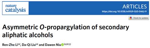 近日,四川大學化學工程學院鈕大文教授團隊在Nature Catalysis上在線發(fā)表了題為“Asymmetric O-propargylation of secondary aliphatic alcohols”的研究論文,首次成功實現(xiàn)了對二級脂肪醇的不對稱炔丙基化反應。文章所有工作均在四川大學完成,鈕大文教授為通訊作者、四川大學為通訊作者單位。論文第一作者為我校博士生李仁哲、第二作者為碩士生劉達奇,論文第一作者單位為四川大學。