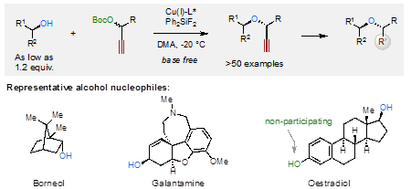 研究人員嘗試利用Cu催化反應突破以上難題。他們通過對反應機理的深入研究,發(fā)現(xiàn)造成親電試劑分解的主要原因可能是堿的使用。以此為突破口,他們嘗試從反應條件中移除堿。通過實驗研究,最終發(fā)現(xiàn)堿的移除果然大大降低了親電試劑的分解速度。此后,團隊進一步通過調整反應的其它要素,首次成功實現(xiàn)了對二級脂肪醇的不對稱炔丙基化反應。該反應條件十分溫和,并且具有很好的普適性。所得產物也可以快速轉化成各種手性醚,可能作為藥物化學研究的重要中間體。