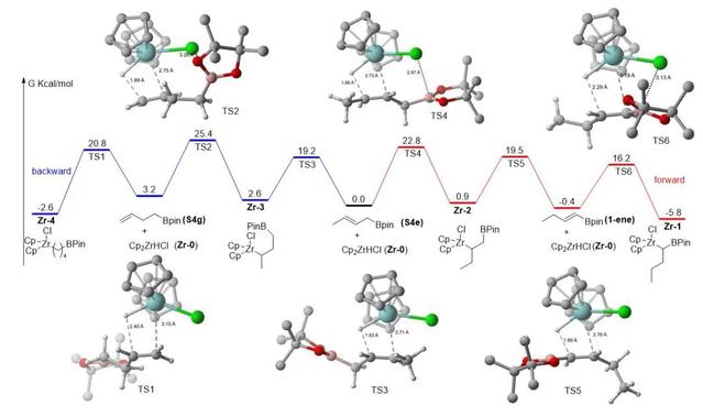 該項研究是科研團隊在突破可見光促進單一鎳催化的烷基鋯交叉偶聯(lián)反應后的又一新的方向。烷基鋯試劑具有“鏈行走”遠程遷移特點,但是鋯試劑遠程遷移通常生成熱力學穩(wěn)定的端頭一級鋯試劑,而由熱力學穩(wěn)定的一級鋯試劑通過“鏈行走”遠程逆遷移生成二級烷基鋯試劑并沒有被發(fā)現(xiàn)。該研究團隊實現(xiàn)了通過端位硼酸酯基團誘導鋯試劑選擇性遠程遷移方向的控制,成功實現(xiàn)了一級鋯試劑遠程逆遷移生成二級烷基鋯硼試劑的過程。作者還通過DFT 計算具體探索了硼酸酯導向鋯試劑遷移的詳細過程,解析了烷基鋯硼試劑穩(wěn)定性及其高反應活性的原因。