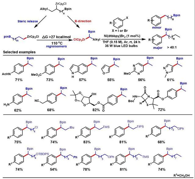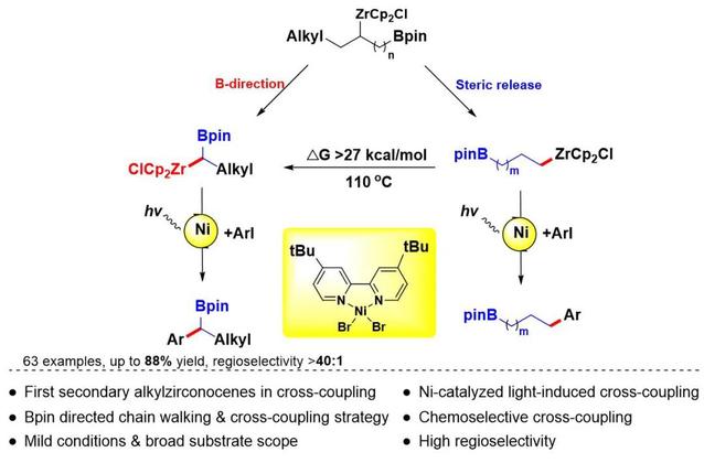 有機鋯試劑在烷烴長鏈上行走(“鏈行走”)并活化遠端化學鍵特性被發(fā)現(xiàn)近半個世紀來(1974年),如何控制鋯金屬的選擇性遷移,遷移方向以及如何活化烷烴端頭單鍵等科學問題一直沒有被解決。作者近期發(fā)現(xiàn)了烷基鋯遠程遷移的可控性,實現(xiàn)了硼酸酯對鋯試劑“鏈行走”遠程遷移的導向控制,高效構建了同碳鋯硼物種。在此基礎上,作者進一步開發(fā)了簡單可見光促進鎳催化的烷基鋯硼試劑與芳基鹵化物交叉偶聯(lián)方法,實現(xiàn)了具有手性中心的二級烷基硼試劑的高效合成。