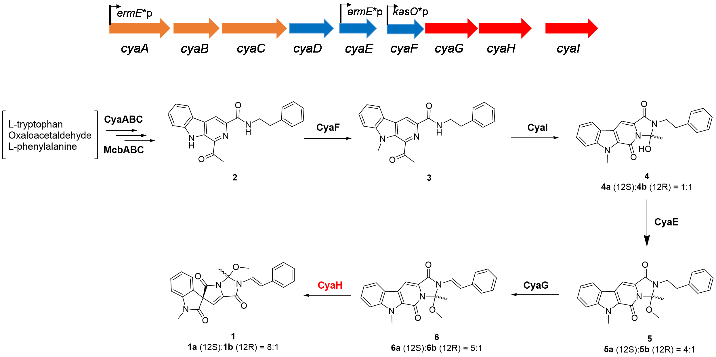 生物堿cyanogramide(1)分離自海洋來源稀有放線菌Actinoalloteichus cyanogriseus WH1-2216-6,含有罕見的氧化吲哚螺[3,4]吡咯[1,2-c]并咪唑結(jié)構(gòu),可有效逆轉(zhuǎn)腫瘤細(xì)胞株耐藥性,如阿霉素(adriamycin)抗性細(xì)胞株K562/A02,MCF-7/Adr和長春新堿(vincristine)抗性細(xì)胞株KB/VCR。野生菌株中1的產(chǎn)量極低,限制了對其進(jìn)行更廣泛的生物活性評估和深入研發(fā)。微生物次級代謝產(chǎn)物生物合成研究是發(fā)現(xiàn)新穎合成機(jī)制、提高產(chǎn)量和增加結(jié)構(gòu)多樣性的有效途徑。研究人員通過合成生物學(xué)技術(shù)手段,在異源宿主Streptomyces coelicolor YF11中重構(gòu)了1的生物合成基因簇,成功實(shí)現(xiàn)了1的異源表達(dá),與野生型相比,1的產(chǎn)量顯著提高。同時,從異源表達(dá)菌中分離鑒定了9個結(jié)構(gòu)類似物,包括5個新化合物cyanogramide B-D(4-6),marinacarbolines E-F(3,8)。進(jìn)一步研究發(fā)現(xiàn),化合物4為外消旋體,化合物5、6和1是對映異構(gòu)體混合物,比例分別是5a/5b為4:1,6a/6b為5:1,1a/1b為8:1,其中,6a的絕對構(gòu)型通過單晶衍射確定為12S。經(jīng)過系統(tǒng)的基因缺失、次級代謝中間體分離鑒定和前體喂養(yǎng)實(shí)驗(yàn),闡明了cyanogramide的生物合成途徑(圖1)。
