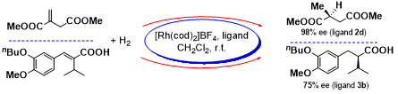 采用葡萄糖苷型亞磷酸酯配體原位制備的銠手性絡(luò)合物,在較溫和的反應(yīng)條件下,以功能化烯烴為底物,在不對稱氫化反應(yīng)中可獲得高達(dá)98%對映選擇性(如圖式1和2所示)。