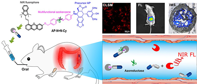 研究人員創(chuàng)新性地設(shè)計合成了一種新型的偶氮基前藥AP-N=N-Cy,該偶氮基前藥由前體藥物分子(AP)通過多功能的偶氮苯基團(tuán)與近紅外熒光團(tuán)(Cy)相連接而成。研究結(jié)果表明:該偶氮基前藥不僅可作為對偶氮還原酶響應(yīng)的近紅外探針以實時示蹤藥物遞送過程,而且還可作為抗癌藥物分子(AdP)的遞送平臺。在偶氮還原酶存在的情況下,AP-N=N-Cy中的多功能偶氮苯基會發(fā)生斷裂進(jìn)而釋放AdP和Cy,其偶氮苯基團(tuán)充當(dāng)了開啟Cy熒光的開關(guān),它的引入使得該偶氮基前藥具有了獨特的熒光開-關(guān)特性?;谂嫉€原酶會特異性地在結(jié)腸中分泌,該偶氮基前藥實現(xiàn)了在結(jié)腸中特異性的定位遞送與靶向釋放。