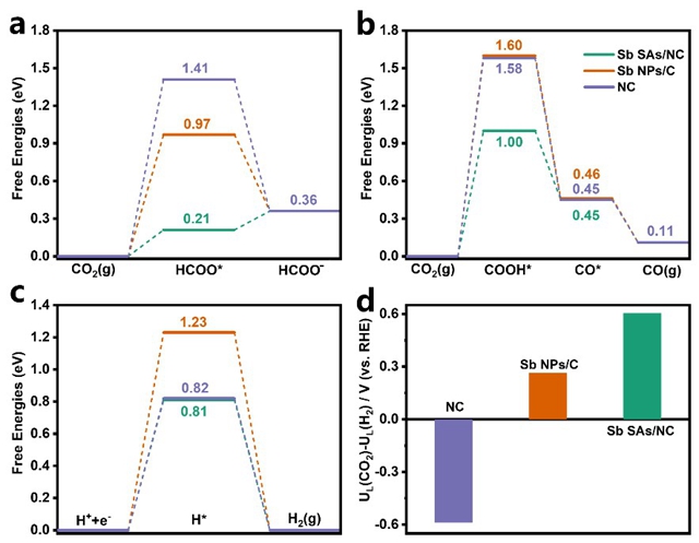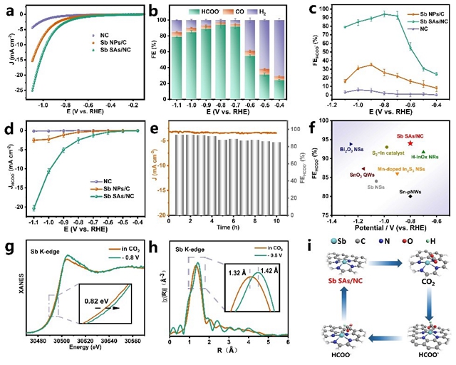 人類向大氣中排放的二氧化碳不斷增加,引起了巨大的氣候變化。利用可持續(xù)能源發(fā)電,將二氧化碳轉化為一系列高附加值產品,作為解決能源短缺和環(huán)境問題的有效途徑,越來越受到重視。甲酸或甲酸鹽是一類重要的儲氫材料,也是許多工業(yè)反應中的關鍵化學中間體,電化學方法還原CO2生產甲酸或甲酸鹽被認為是目前最具經濟可行性的技術方案。陳文星等構筑了一種以Sb-N4為主體的Sb單原子催化劑(Sb SAs/NC)可以高效催化CO2RR轉化為甲酸鹽,Sb SAs/NC在?0.8 V (vs. RHE)下表現(xiàn)出高達94.0%的甲酸法拉第效率。原位X射線吸收精細結構(XAFS)研究和密度泛函理論(DFT)計算表明,優(yōu)異的CO2RR活性來源于帶正電的Sbδ+-N4(0<δ<3)活性中心。本研究結果對原子尺度上合理設計和精確調控CO2RR的主族金屬(Sb、In、Sn、Bi等)催化劑具有重要的指導意義。