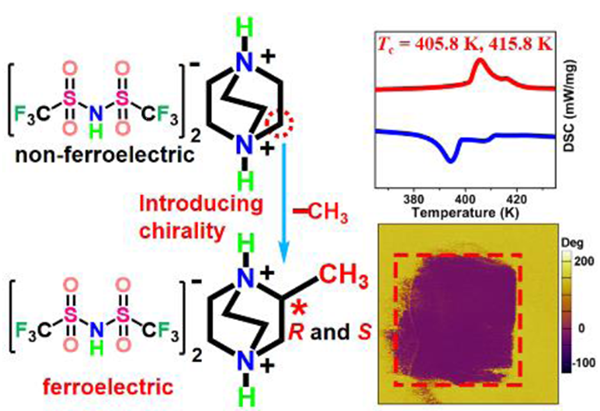 手性和鐵電性之間的淵源可以追溯到1920年第一個鐵電體的發(fā)現(xiàn),即含有酒石酸根手性離子的羅息鹽。在分子材料的構(gòu)筑過程中,只有單一手性分子的參與才能有效保證非中心對稱晶格的形成。明星分子Dabco集中了非常多的鐵電課題,諸多科研人員多年持續(xù)圍繞其開展鐵電研究。通常,理論上認為手性化后的Dabco分子更加容易成為潛在的鐵電體。如Dabco甲基化等,但是實際上非常奇怪和特殊,一直以來科研人員嘗試的甲基化等手性修飾后的Dabco全部以失敗告終,一直沒有實現(xiàn)手性Dabco的鐵電特性,難度非常大。我們首次成功解決了這個難題。這為明星鐵電分子Dabco的衍生和拓展出更多的優(yōu)異特性鐵電材料提供了非常有幫助的策略。該成果被編委會在WileyChem’s Wechat platform介紹(chemistry news outlet in China)。從實驗上再次驗證了手性化鐵電設(shè)計策略的高概率和鐵電理論。