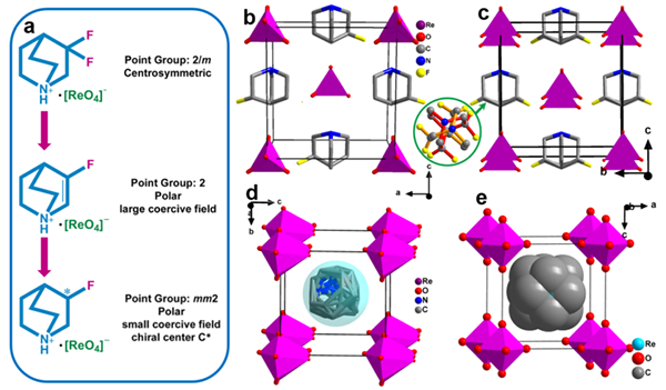 多軸分子鐵電體的創(chuàng)新性發(fā)展迫在眉睫。為了尋求成本低、生物相容性和機械靈活性好的分子鐵電材料,團隊基于奎寧環(huán)高錸酸鹽化合物,采用氟/氫取代策略(圖1),成功地設(shè)計了一例多極軸分子鐵電體,其多極軸特征表現(xiàn)為極好的薄膜宏觀鐵電性(圖2)。氟化作用不僅增加其飽和極化值,還大大降低了矯頑場強。進一步深入研究了氟代效應(yīng)對晶體結(jié)構(gòu)對稱性和鐵電性的影響。有趣的是,其還是已知分子鐵電材料中最軟的,10.5 HV的低維氏硬度可與聚偏二氟乙烯(PVDF,11.6 HV)相媲美,但比BaTiO3(869 HV)低近兩個數(shù)量級。這些特性使其在可穿戴柔性設(shè)備以及生物力學應(yīng)用領(lǐng)域具有巨大的潛在應(yīng)用前景。