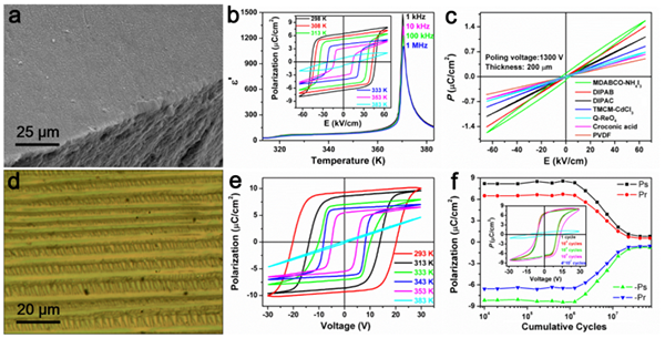 圖2(a)粉末壓片SEM圖;(b)介電溫度依賴性,插圖為粉末壓片測得的P-E電滯回線;(c)相同電場下,部分典型分子鐵電體粉末壓片狀態(tài)的P-E關(guān)系,(d)薄膜光學顯微鏡照片;(e)薄膜P-E電滯回線;(f)鐵電薄膜疲勞特性
