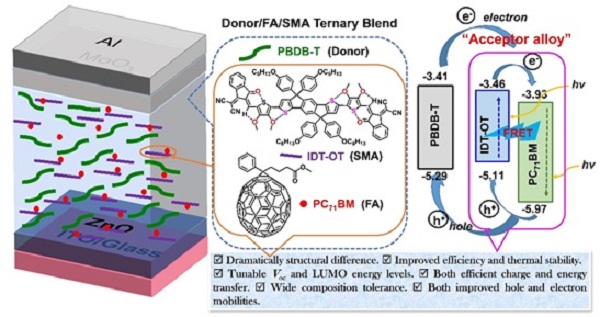該論文通過引入新型小分子受體材料IDT-OT構(gòu)筑了高效三元聚合物太陽能電池,研究表明,小分子受體和富勒烯類受體間形成的合金是該三元體系的光伏性能和熱穩(wěn)定性提高的根本原因。研究證實(shí),該受體合金之間同時(shí)存在能量轉(zhuǎn)移和電荷轉(zhuǎn)移,其工作機(jī)理目前文獻(xiàn)罕見報(bào)道。論文第一作者碩士研究生尹攀,通訊作者是沈平教授。