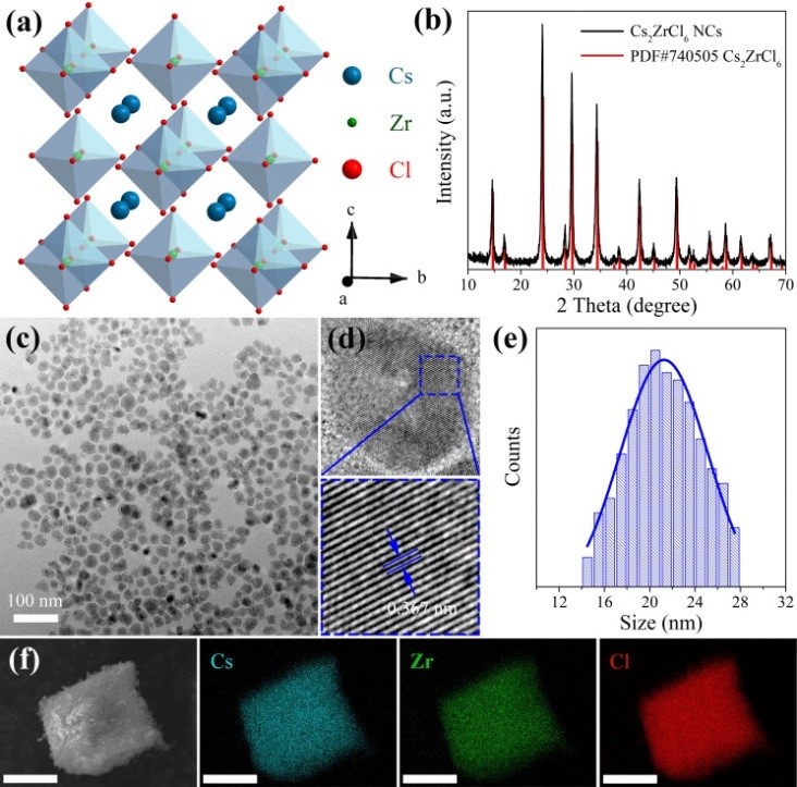 在該研究工作中,研究人員圍繞自然界中豐富且無毒的金屬鋯(Zr)元素,通過熱注射法首次合成出空位有序Cs2ZrBrxCl6-x(0≤x≤1.5)雙鈣鈦礦納米晶體。該納米晶展現(xiàn)出顏色可調(diào)節(jié)的且有效的光致發(fā)光特性以及良好的穩(wěn)定性。研究人員利用變溫?zé)晒夤庾V和變溫時(shí)間分辨熒光光譜,并借助自主研發(fā)的納秒瞬態(tài)發(fā)射光譜儀以及泵浦-探測飛秒時(shí)間分辨光譜儀揭示了熱活化延遲熒光機(jī)制,為開發(fā)新型無機(jī)熒光粉提供了獨(dú)特的策略。