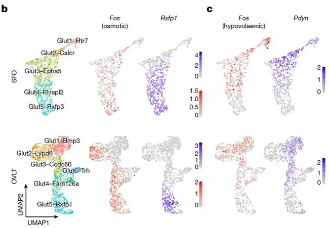 3b和c:SFO(上側)和OVLT(下側)興奮性神經(jīng)元Rxfp1、Pdyn基因表達量(藍色),與兩種渴覺狀態(tài)下Fos基因的表達量(紅色)。b為高滲透性口渴狀態(tài),c為低血容量口渴狀態(tài)?;虮磉_量都經(jīng)log標準化。