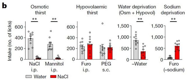圖2b:不同渴覺狀態(tài)下,小鼠對純水(灰色)和NaCl溶液(紅色)的攝入量。