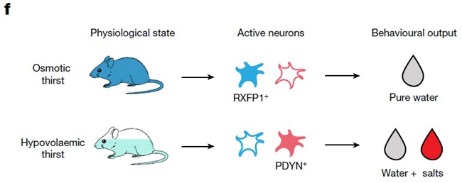 圖1:調控兩種渴覺狀態(tài)的細胞基礎的示意圖。高滲透壓口渴激活Rxfp1+神經(jīng)元,動物尋求純水以稀釋血液;低血容量口渴激活Pdyn+神經(jīng)元,動物同時攝入水和鹽(礦物質)溶液以維持內環(huán)境穩(wěn)態(tài)。
