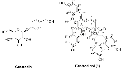 中國科學(xué)院昆明植物研究所天然藥物新藥研發(fā)團(tuán)隊(duì)周俊課題組一直專注于天麻中活性成分的挖掘。上世紀(jì)七八十年代,條件異常艱苦的情況下,周俊等通過對(duì)天麻主要成分的藥學(xué)研究,從中發(fā)現(xiàn)了治療頭痛、失眠的有效成分天麻素(gastrodin, figure 1),隨后開展了合成天麻素的研究,1980年轉(zhuǎn)讓給昆明制藥廠,生產(chǎn)至今,創(chuàng)造了很好的經(jīng)濟(jì)效益。天麻的化學(xué)研究與主成分的確定為天麻產(chǎn)業(yè)發(fā)展提供了有力的科技支撐。