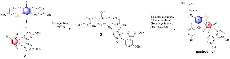 研究人員首先通過F-C烷基化、選擇性地甲基化和Sonogashira偶聯(lián)等10步反應(yīng)高效的合成了片段1;利用Knoevenagel反應(yīng)和溴代等4步反應(yīng)制備了片段2。最后利用匯聚式合成的策略,片段1和2經(jīng)過Sonogashira 偶聯(lián)得到中間體3,然后經(jīng)過林德拉還原將炔還原為反式的雙鍵。反式雙鍵在光照的條件下(Hg lamp, 500W)首先異構(gòu)化為順式雙鍵,緊接著關(guān)環(huán)和芳構(gòu)化成功的構(gòu)建了B環(huán),最后脫去芐基順利地得到了天然產(chǎn)物gastrodinol (200mg), 為進(jìn)一步的藥理活性實(shí)驗(yàn)提供了足夠的原料保證。