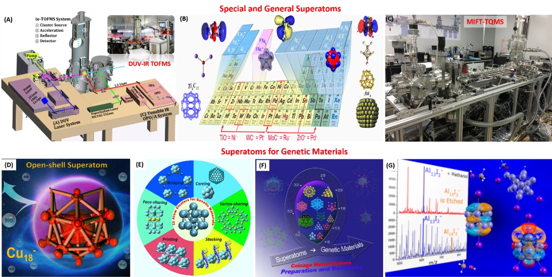 圖1. (A) 自主研制的國家重大儀器(深紫外二期子項目)DUV+IR質(zhì)譜光譜儀;(B) 狹義和廣義超原子概念的提出 (Acc. Chem. Res. 2014,47, 2931); (C) 基于科學(xué)院儀器研制項目支持的離子層流反應(yīng)管串聯(lián)自定義多重四極質(zhì)譜系統(tǒng);(D) 開殼層超原子團簇Cu18-的發(fā)現(xiàn) (J. Phys. Chem. Lett., 2020, 11, 5807); (E/F) 金屬團簇應(yīng)用于材料基因 (Coord. Chem. Rev., 2019, 400, 213053; 2020, 213643);(G) 鹵素配體保護/活化超原子團簇(Chem. Sci. 2016, 7, 3067)